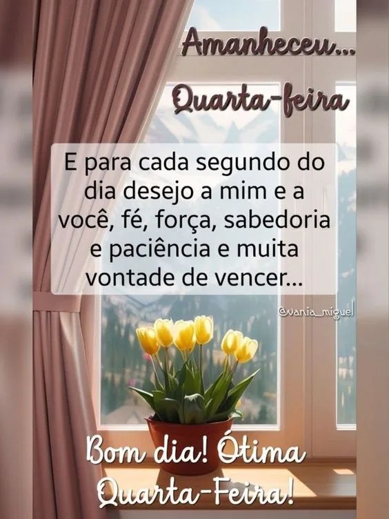 Para a Quarta-feira! Que esta nova manhã traga muita alegria e otimismo para o seu dia. Lembre-se que cada novo amanhecer é uma nova oportunidade de ser feliz, de realizar sonhos e de aproveitar as belezas da vida. Bom dia!